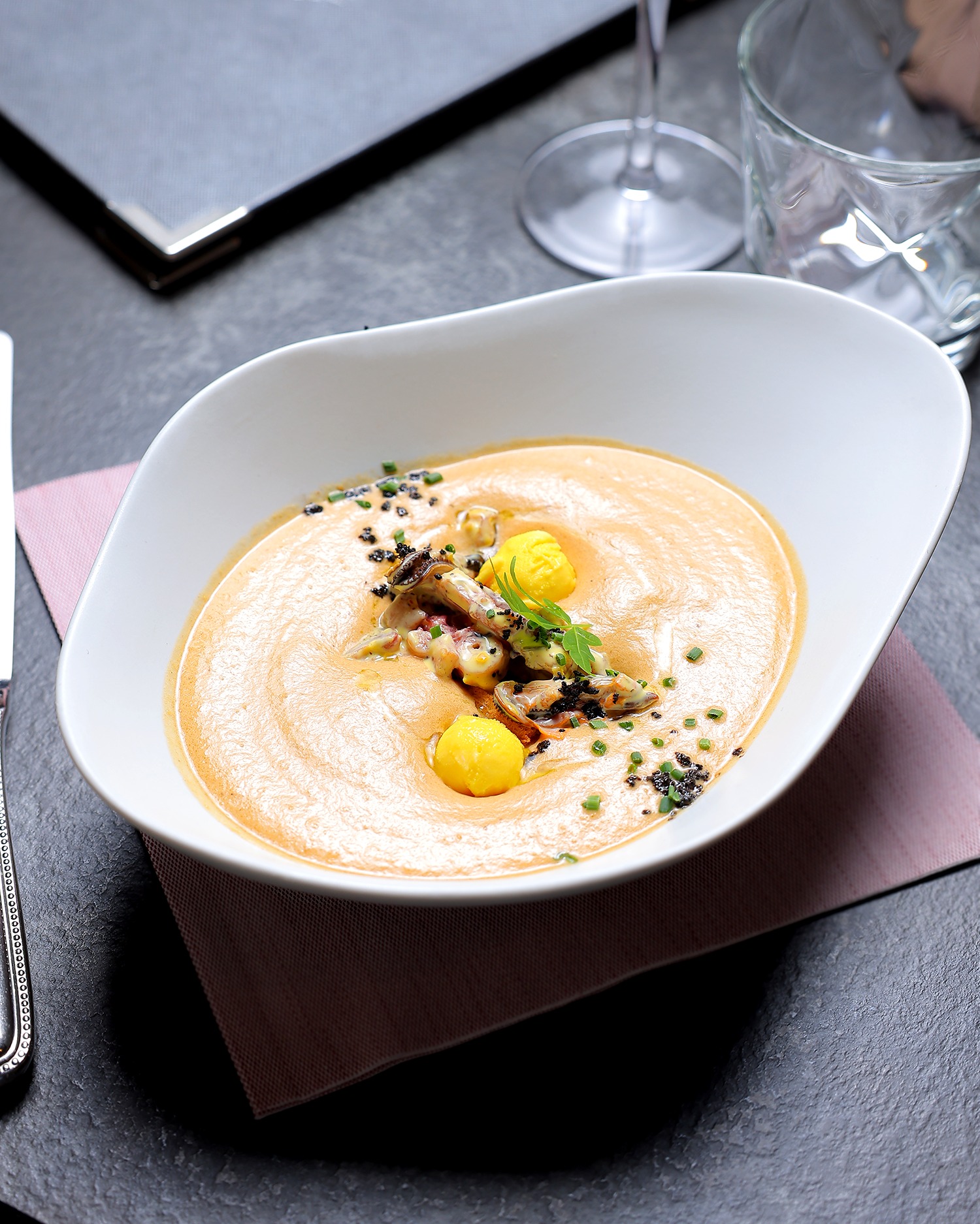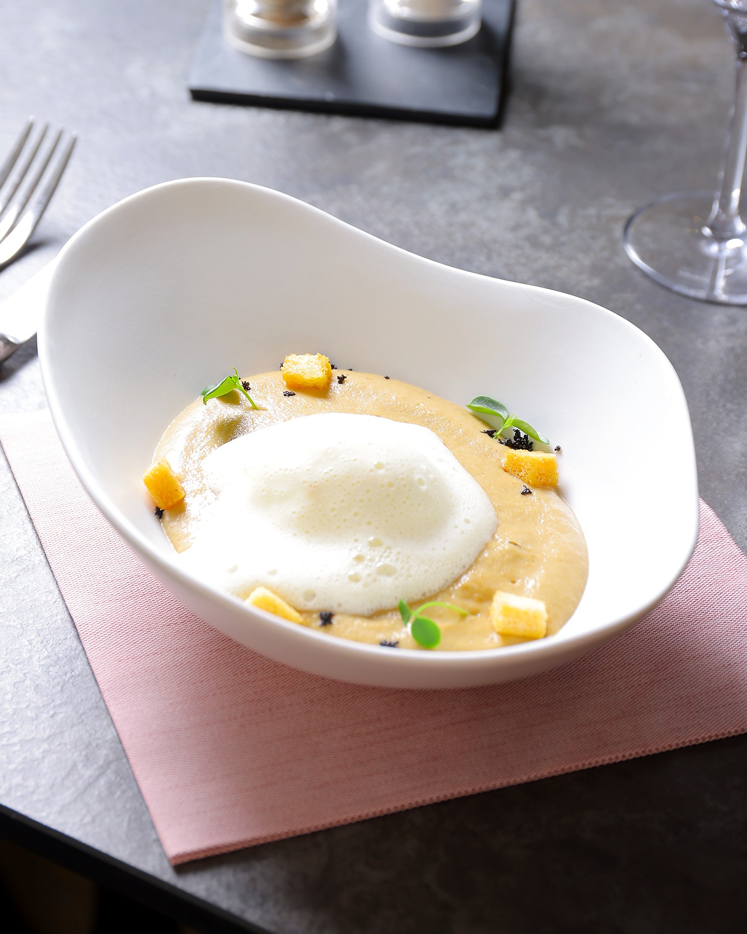 Compotée d’oignons au banyuls, crème à l’huile de truffe